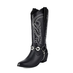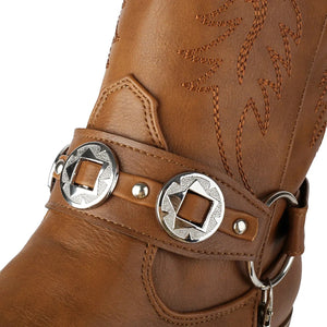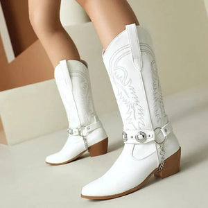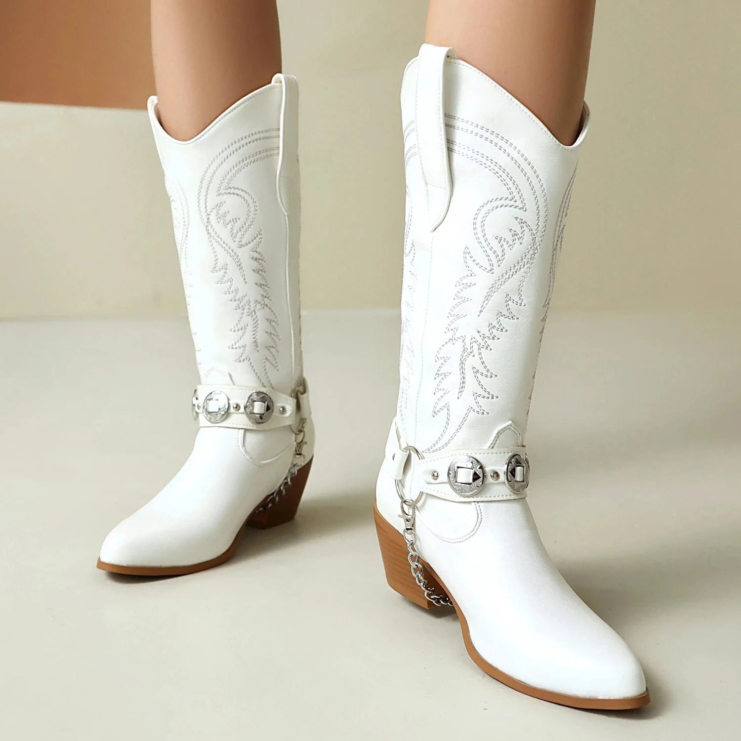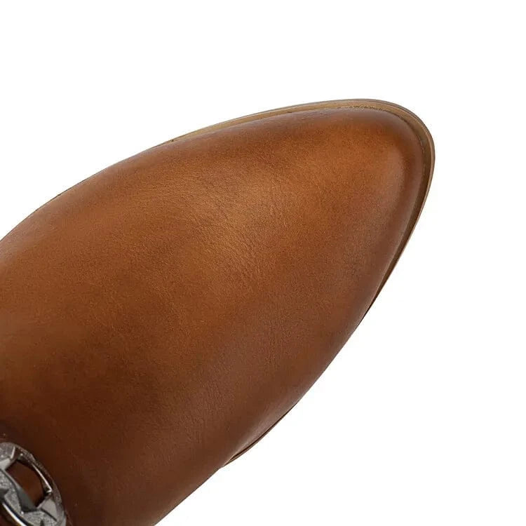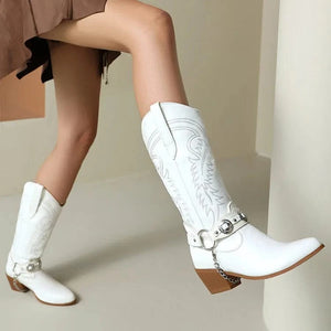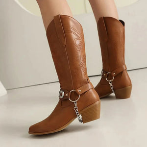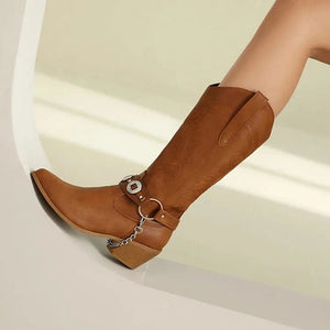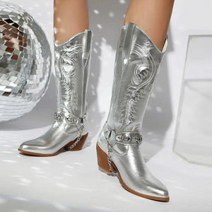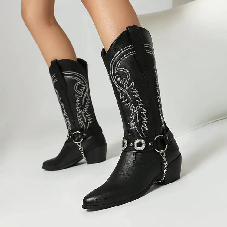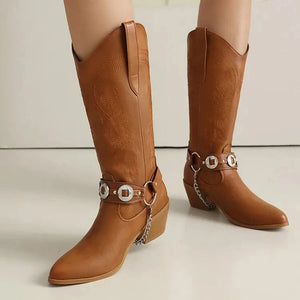 Sätt ner foten med stil – bokstavligt talat. Våra äkta cowboy boots för dam kombinerar tidlös westernattityd med moderna detaljer som glänsande kedjor, elegant spetsig tå och en kraftfull klack som lyfter både din look och ditt självförtroende. Oavsett om du dansar på en countryfestival eller vill sätta en edgy touch till din vardagsoutfit, är de här bootsen din perfekta följeslagare.