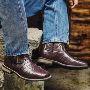 Ge din look en autentisk westernkänsla med våra Brun Alligator Cowboy Boots – en hyllning till cowboyens stolthet och tidlös manlighet. Varje detalj, från det reptilinspirerade mönstret till den distinkta fyrkantiga tån, utstrålar självsäkerhet och raffinerad stil. Dessa stövlar är skapade för dig som vill kombinera robust charm med bekväm elegans – oavsett om du kliver in på saloonen eller på stadens gator.