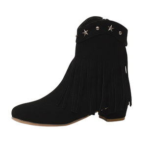 Lyft varje steg med våra ankelboots i mocka med fransar – där bohemisk frihet möter cowboy-elegans. Oavsett om du rider genom stadens gator eller dansar under stjärnorna, ger dessa boots dig både stil och komfort. Den fyrkantiga klacken ger stabilitet, medan fransarna rör sig med dig – för en look som andas rörelse och självsäkerhet.