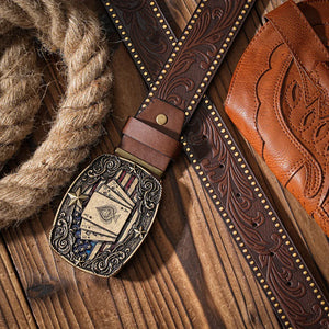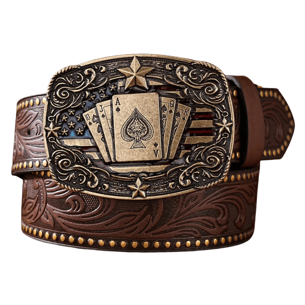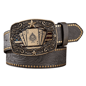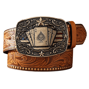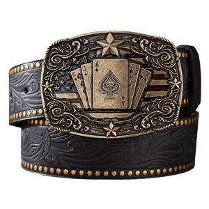 Det här bältet är mer än bara ett tillbehör, det är en symbol för frihet och karaktär. Med sitt mäktiga spänne prytt av spelkort och stjärnor blir det ett blickfång som genast väcker uppmärksamhet. Den präglade läderremmen och den antika metallen skapar en autentisk westernkänsla som du både ser och känner.