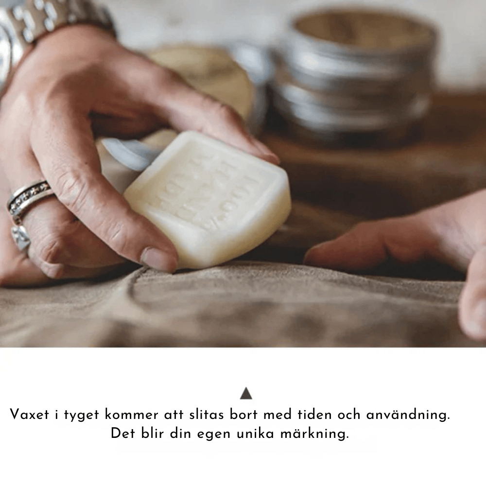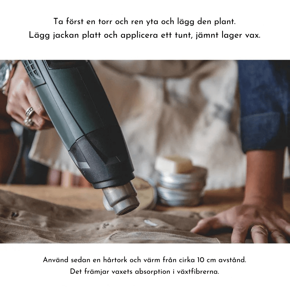 - Tvättråd: Rekommenderas att inte tvättas; torka av med fuktig trasa. Vid behov kan vax appliceras på nytt och värmas in med hårtork.