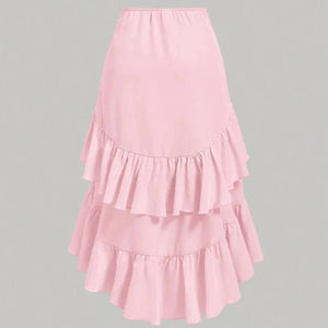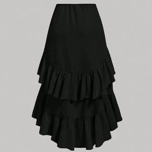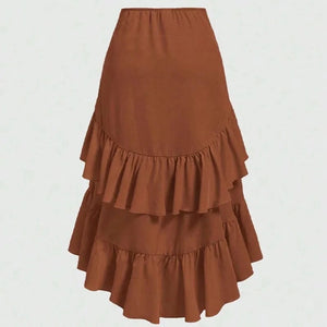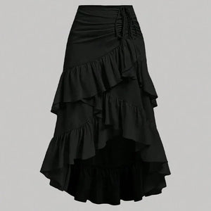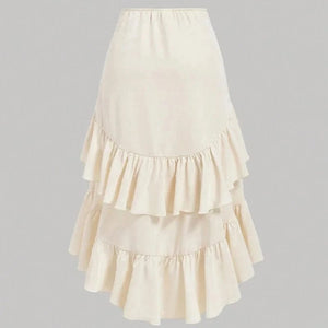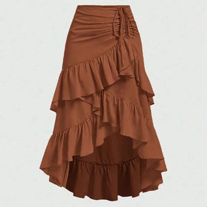 Låt denna asymmetriska långkjol med mjuka volanger och elegant drapering föra in en lekfull, men ändå sofistikerad energi i din garderob. Perfekt för både heta sommardagar och kvällar fyllda av dans och skratt.