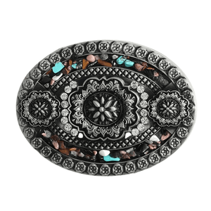 Låt din outfit få den där unika touchen som för tankarna till vida vidder, solvarma präriefester och tidlös boho-stil. Med sitt intrikata blommönster och turkosa detaljer är detta bältespänne mer än bara ett tillbehör – det är en statement-piece som ger din look personlighet och karaktär. Perfekt för dig som vill kombinera vintage-vibbar med western-elegans.