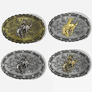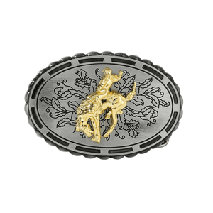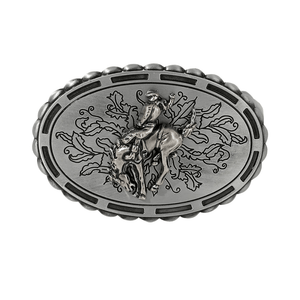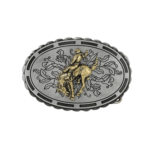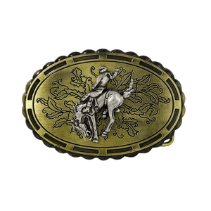 Ge din outfit en djärv och självsäker look med detta detaljerade bältespänne. Med sitt dynamiska motiv av en cowboy till häst är det en accessoar som genast för tankarna till rodeons vilda energi och den klassiska westernstilen.