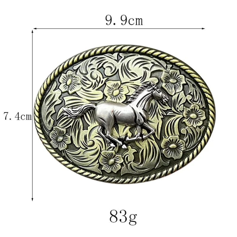 Lyft din westernstil med vårt eleganta bältespänne häst blommor – en detalj som kombinerar kraften hos en vild häst med mjuka blomornament. Med sin antika metallfinish och tidlösa design är det här spännet mer än ett tillbehör – det är en statement-piece som speglar din frihet och passion för cowboylivet. Perfekt både till vardags och för speciella tillfällen.