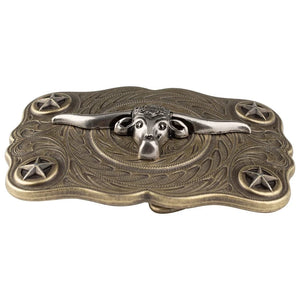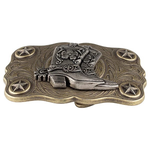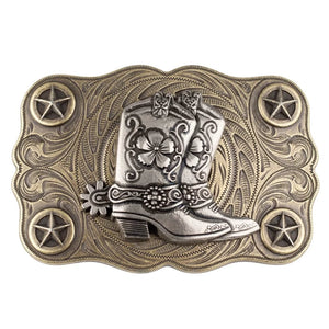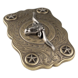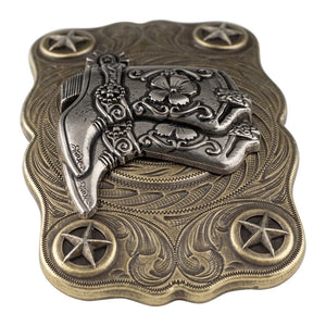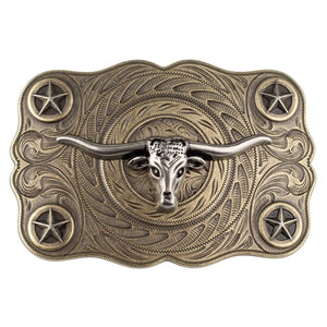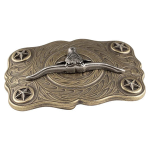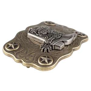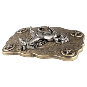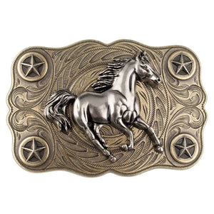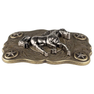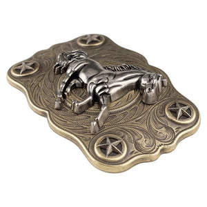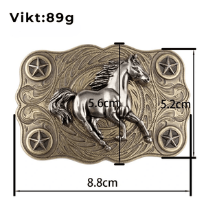 Låt din stil rida fritt med detta magnifika bältespänne i bronsfinish. Med en ståtlig häst i centrum och fyra stjärnor runtom är det en hyllning till både kraft och elegans i klassisk westernanda.