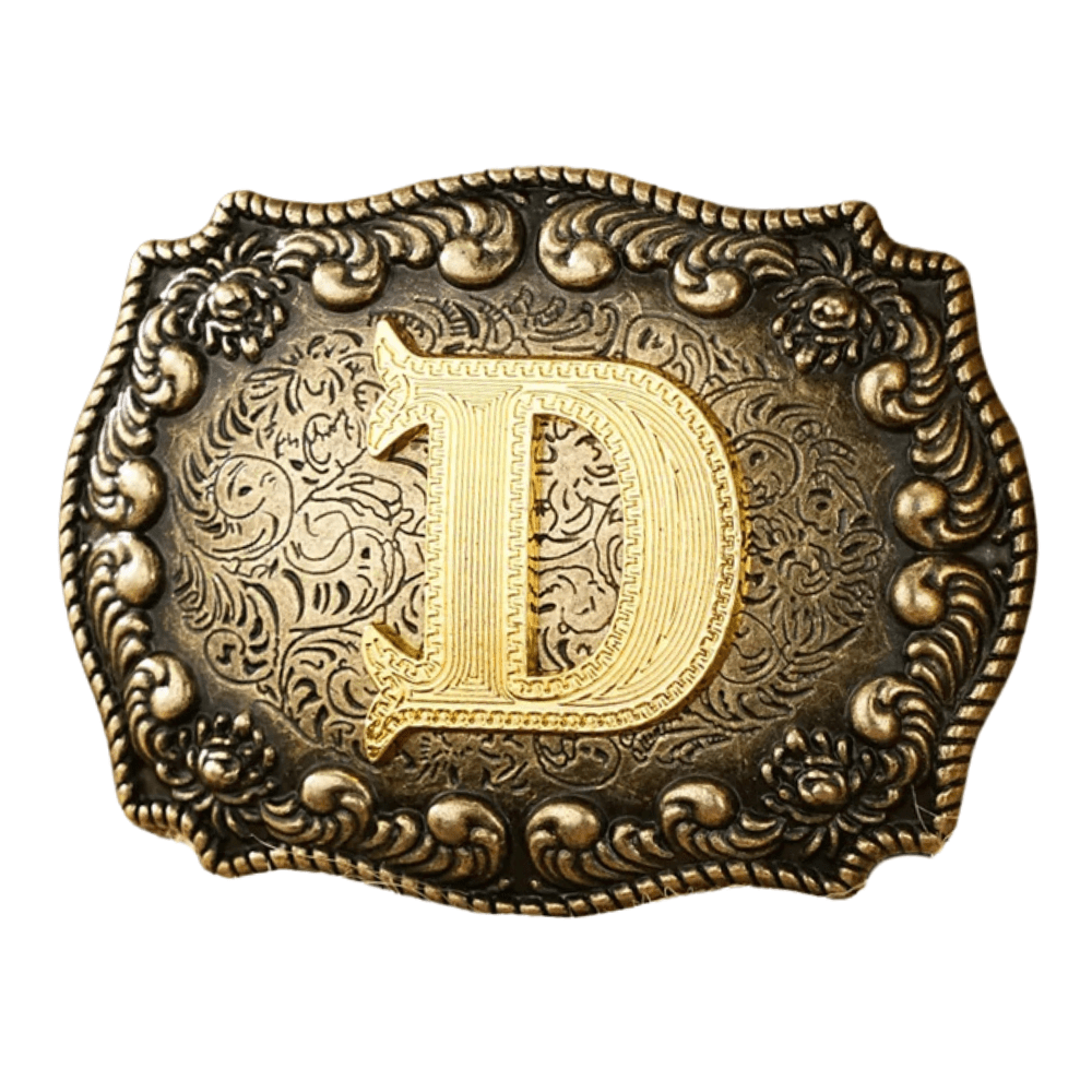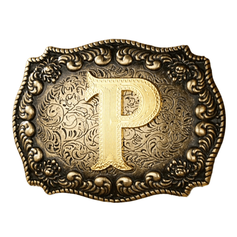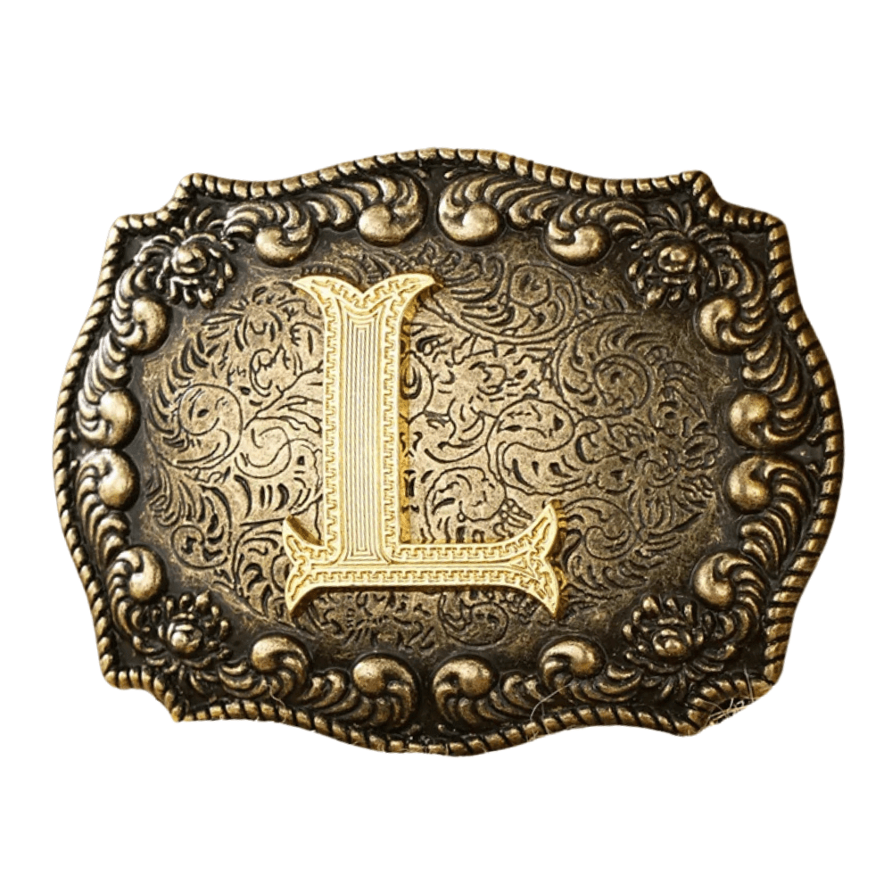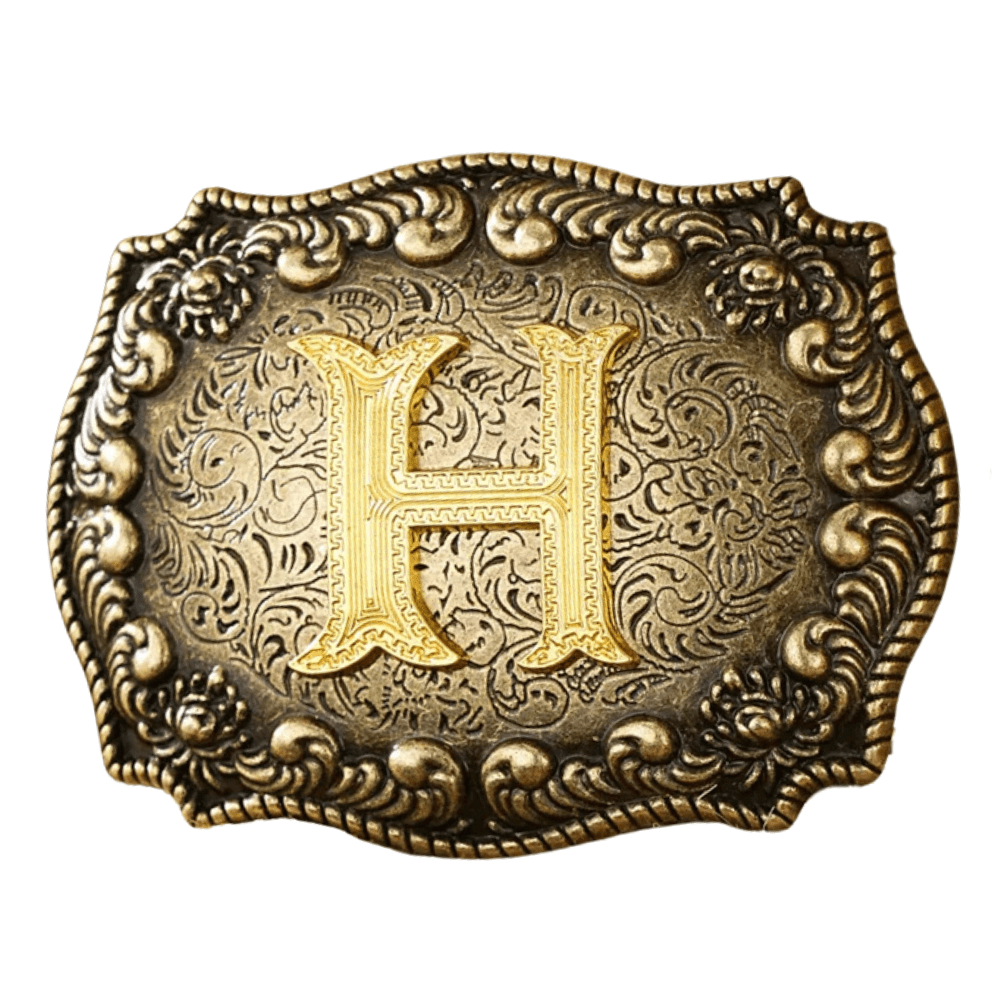 Ge din westernstil en autentisk och personlig prägel med detta antikinspirerade bältespänne. Den gyllene bokstaven framträder mot en mörk bronsbotten med detaljerade mönster, och skapar en accessoar som andas både styrka och tradition.