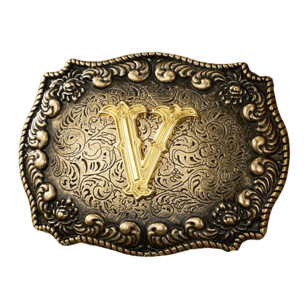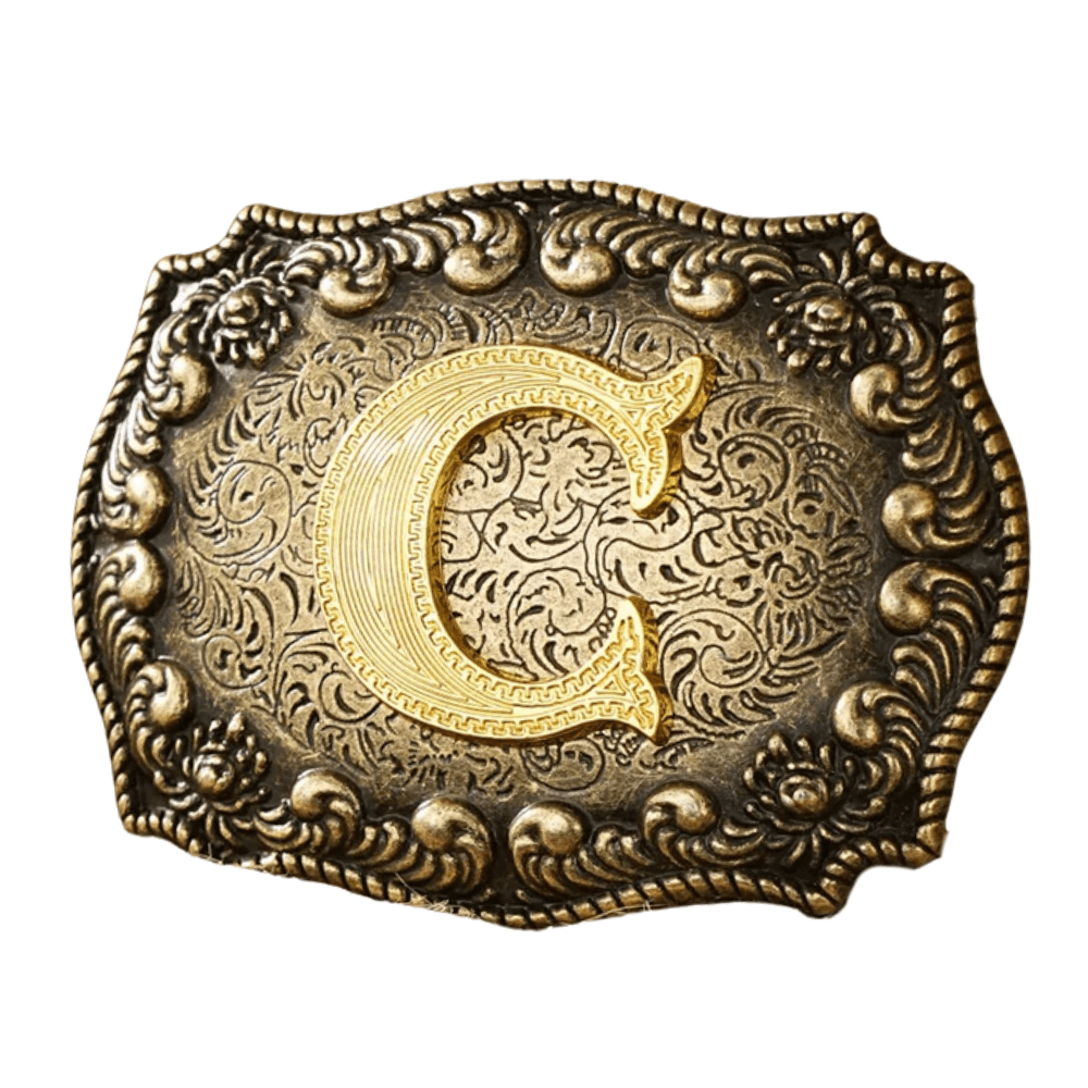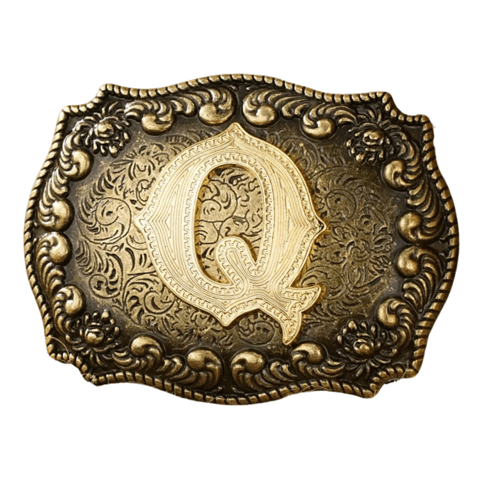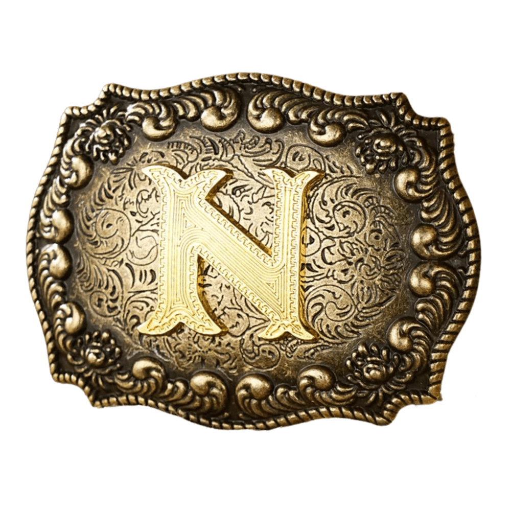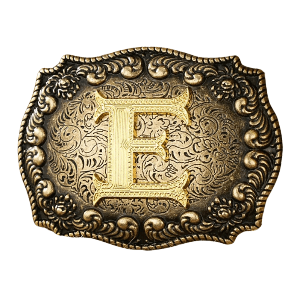 Ge din westernstil en autentisk och personlig prägel med detta antikinspirerade bältespänne. Den gyllene bokstaven framträder mot en mörk bronsbotten med detaljerade mönster, och skapar en accessoar som andas både styrka och tradition.