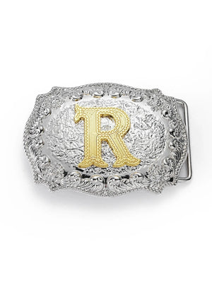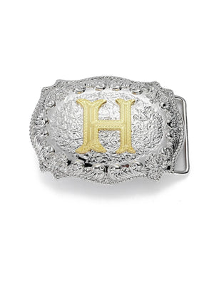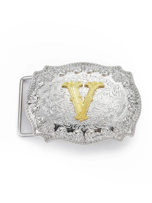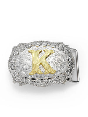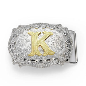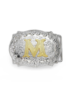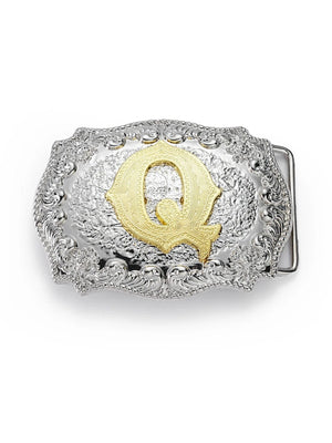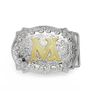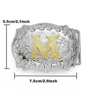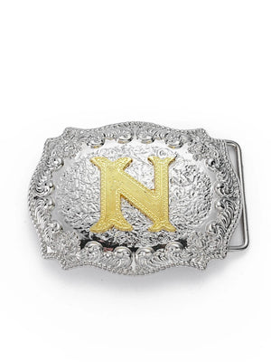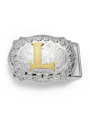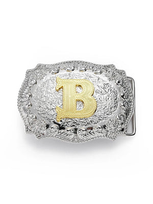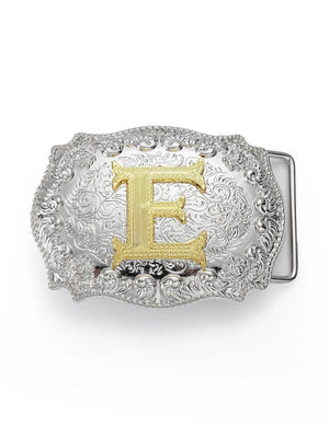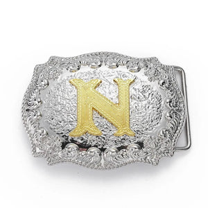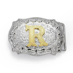 Ge din westernstil en elegant och personlig prägel med detta bältespänne. Den gyllene bokstaven lyfter fram din identitet och förstärks av en detaljrik silverbotten med klassiska västerndekorationer.