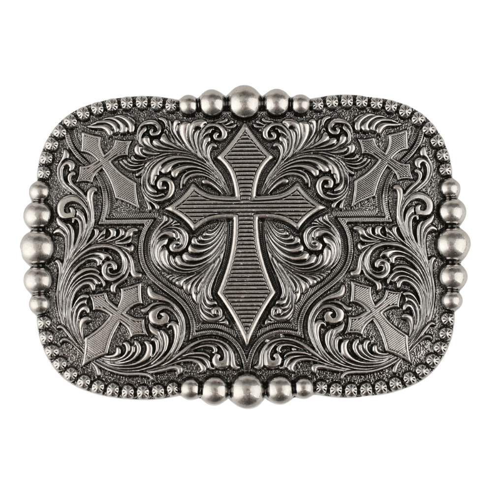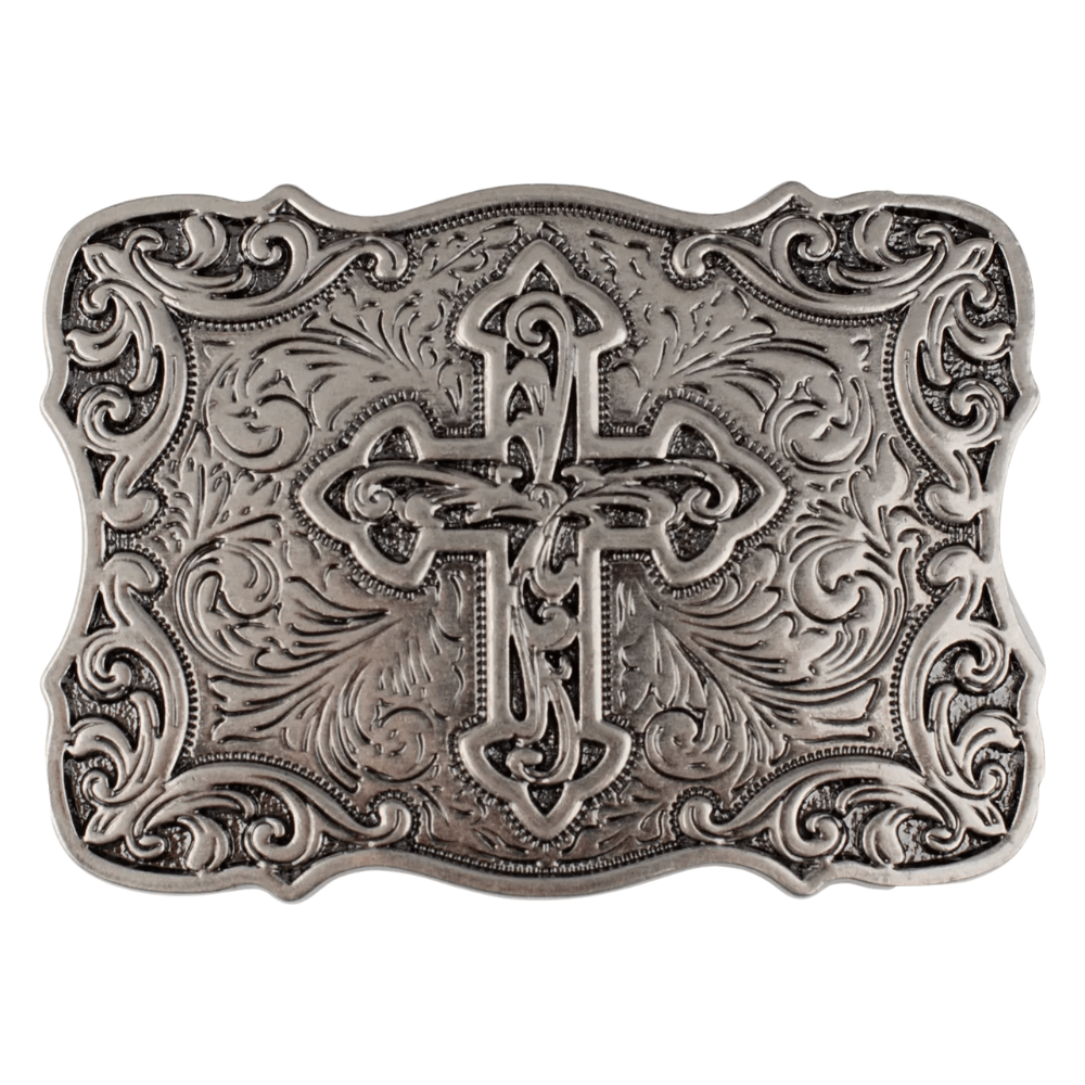 Ge din outfit en stark symbolisk touch med detta bältespänne där korsmotivet möter klassiska westernornament. Den intrikata gravyren och metallens djupa glans skapar en accessoar som utstrålar både styrka och tradition.