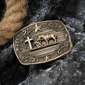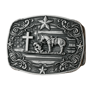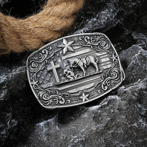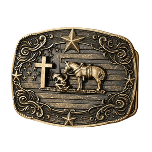 Lyft fram din cowboy-stil med ett bältespänne som talar om både styrka och tro. Med sina detaljerade gravyrer och symboliska motiv blir det en ståtlig accessoar för varje westernälskare.