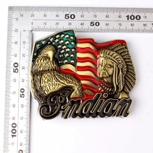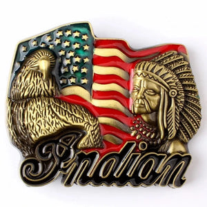Detta bältespänne fångar andan av styrka och frihet med en dramatisk kombination av örn, hövding och USA-flagga. En djärv accessoar som sätter tonen för din outfit.