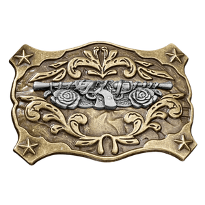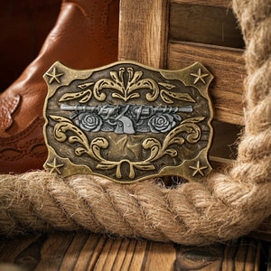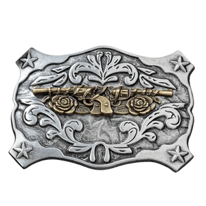 Låt din outfit tala för sig själv med detta karaktärsfulla bältespänne. Den eleganta kombinationen av revolvrar och rosor ger en kraftfull känsla av westernromantik som aldrig går ur tiden.