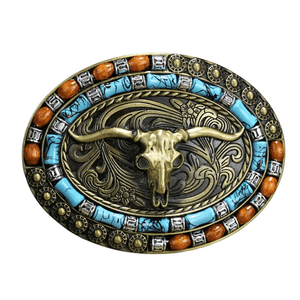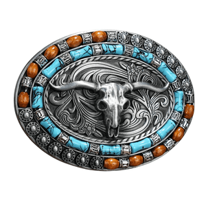 Detta bältespänne förkroppsligar den råa styrkan från prärien, med en detaljerad tjurskalle i centrum, omgiven av dekorativa kanter i turkos och bränd orange. En djärv accessoar för dig som vill bära westernandan med stolthet och elegans.