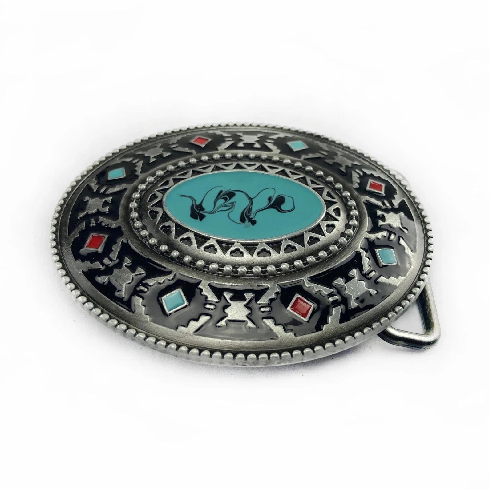 - Form: Ovalt spänne med westernmönster