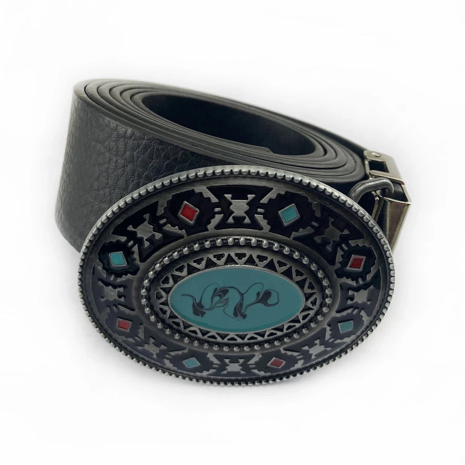 Ge din outfit en unik och livfull touch med detta turkosa bältespänne. Detaljerat med klassiska westernmönster och färgade stenar är det en accessoar som fångar både blickar och beundran.