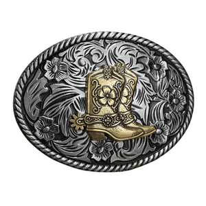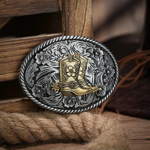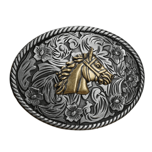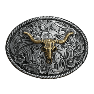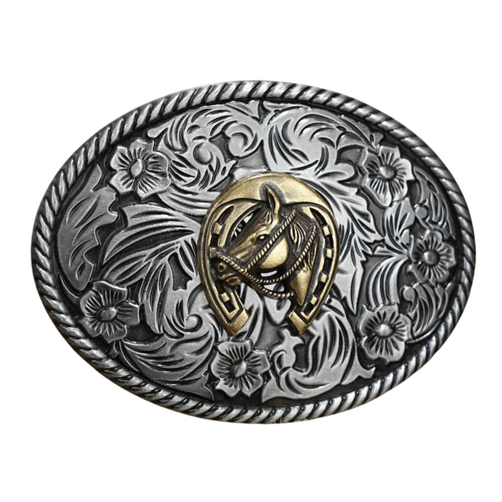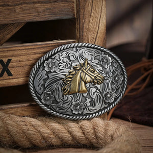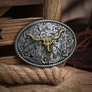 Låt din outfit tala med ett bältespänne som kombinerar elegans och rå westernenergi. De guldfärgade djurmotiven – från boots till hästhuvuden och tjurskallar – står i kontrast mot den mörka, graverade bakgrunden och ger dig en autentisk känsla av prärien.