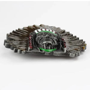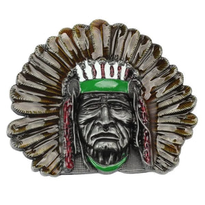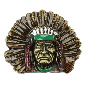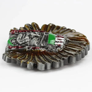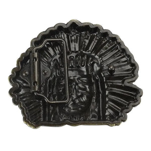 Låt din outfit tala för sig själv med detta bältesspänne i antik guld och silver. Den kraftfulla designen med ett detaljerat indianhuvud gör varje look unik, självsäker och full av karaktär.