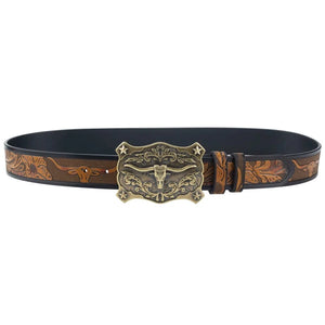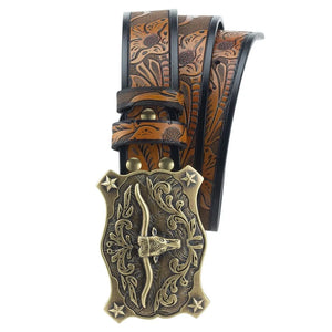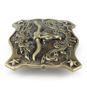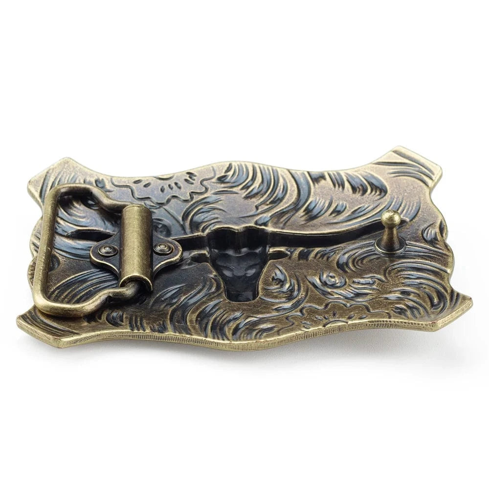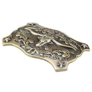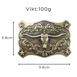 Ge din look en rå och tidlös prägel med detta kraftfulla bältesspänne i antik brons. Longhorn-motivet i centrum, omringat av stjärnor och eleganta snirklar, för tankarna till äkta westernanda och styrka.