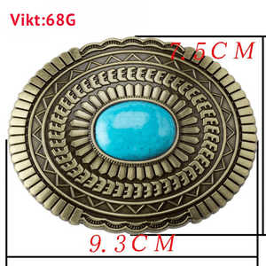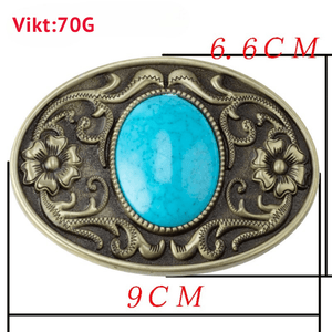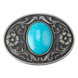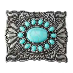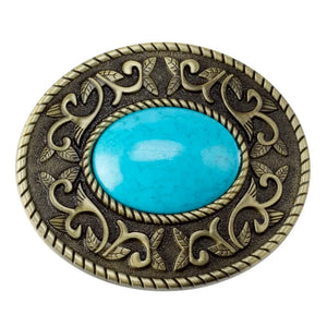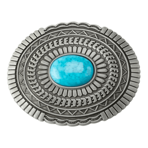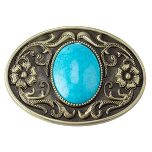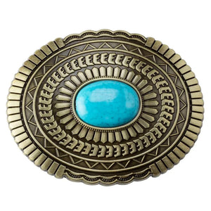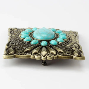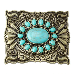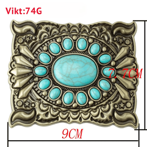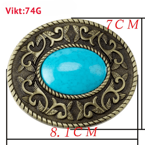 Låt din look tala med detta eleganta bältesspänne, prytt med skinande turkoser och omsorgsfullt utformade mönster i antik guldton. Perfekt för dig som vill bära en bit av western-andan med modern finess.