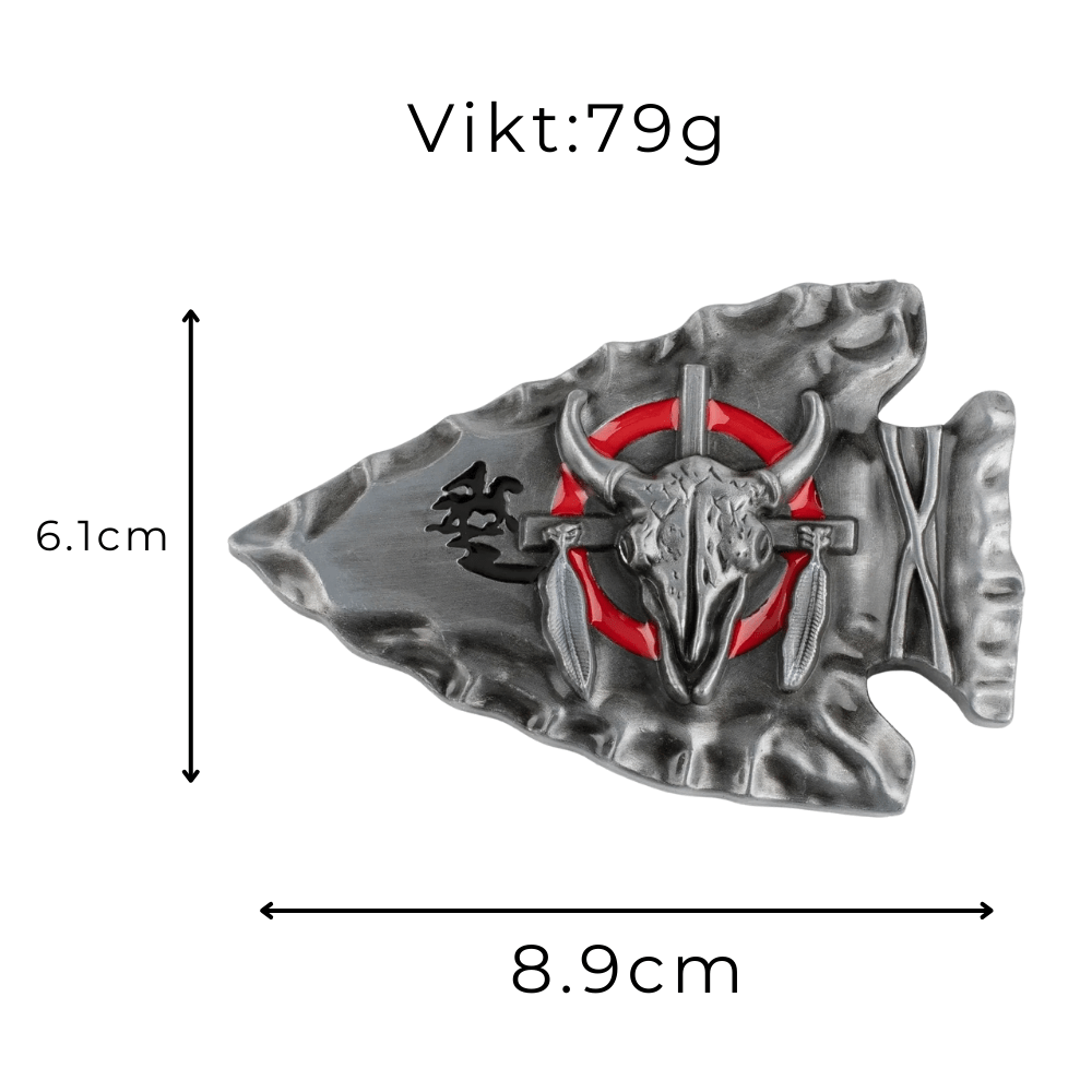 Ett kraftfullt bältesspänne som tar inspiration från prärien och symboliken hos buffeln. Den skarpa pilspets-formen kombinerad med buffelskallen ger din outfit en rå och autentisk känsla – perfekt för dig som vill bära en bit av westerntraditionen vid varje steg.