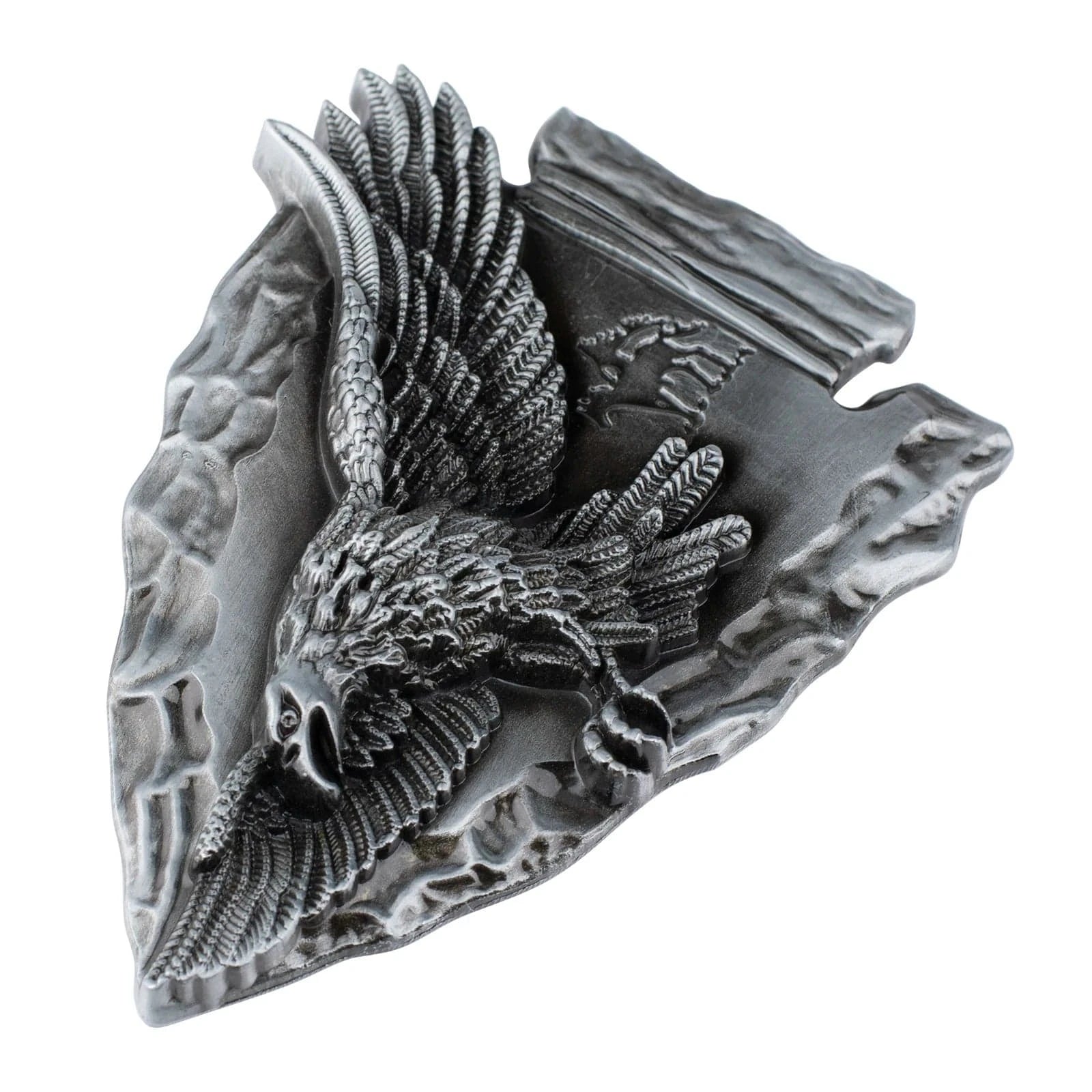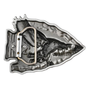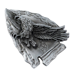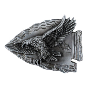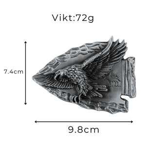 Låt din outfit tala med en rå och tidlös känsla. Detta bältesspänne i form av en pilspets pryds av en mäktig örn med utbredda vingar – en hyllning till frihet, styrka och den vilda västern.