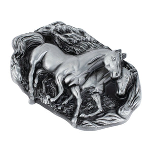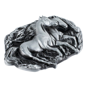 Fånga frihetens känsla och kraften hos den vilda prärien med detta bältesspänne i western stil. Med två galopperande hästar i detaljrik 3D-design blir det en tidlös accessoar som lyfter din outfit till nästa nivå.