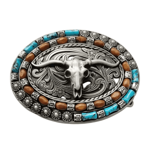 Det här bältesspännet fångar den autentiska westernkänslan med sitt kraftfulla tjurhuvud i centrum, omgärdat av färgade stenar i turkos och brunt. Ett iögonfallande tillbehör som förvandlar din look till något både robust och elegant.
