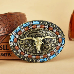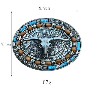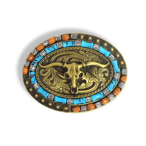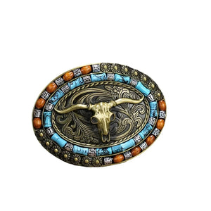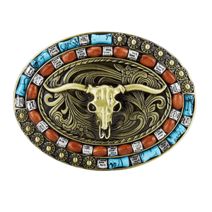Bältesspänne western stil med tjurhuvud och färgade stenar