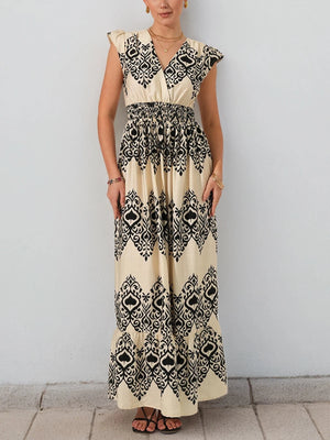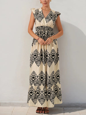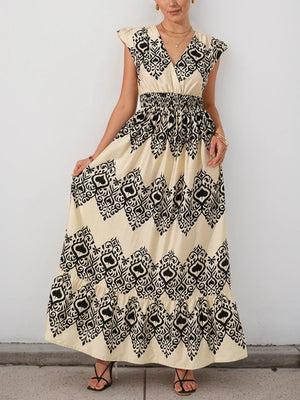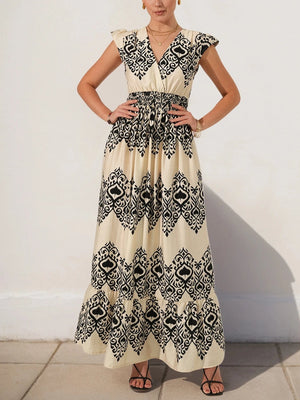 Beige bohemisk maxiklänning med svart mönster – din nya sommarfavorit