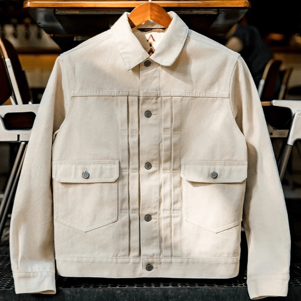 Beige jeans jacka herr som lyfter din vardagsstil med tidlös westernkänsla