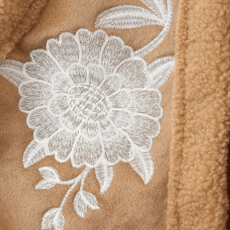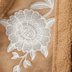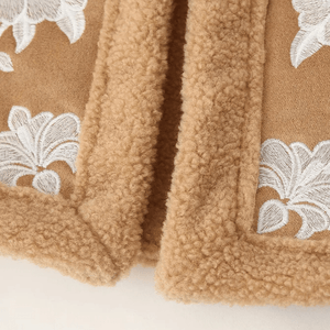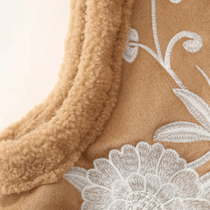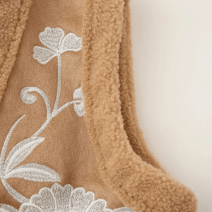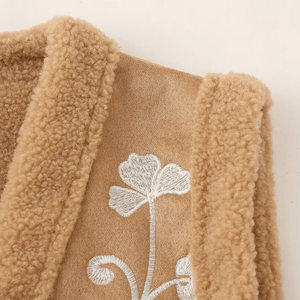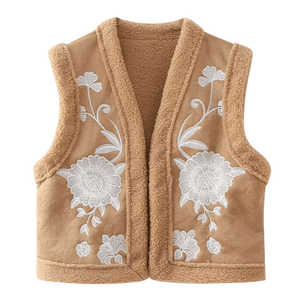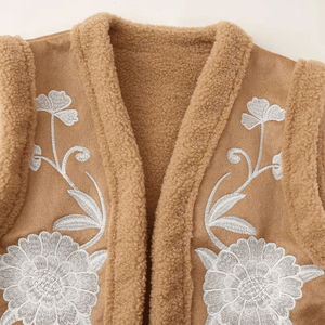 Omslut dig med både värme och elegans i vår beige teddyväst, dekorerad med vita broderier som fångar blicken och ger din outfit en unik western-touch. Perfekt för kyliga dagar när du vill känna dig både avslappnad och stilfull.