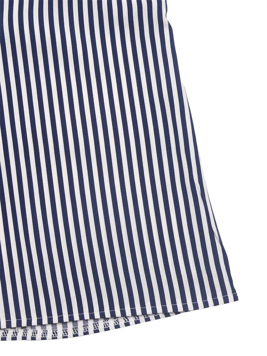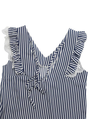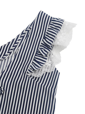 Upplev sommarens friska bris med denna blå och vitrandiga blus. Med lekfulla volangärmar och delikata spetsdetaljer är den skapad för att ge dig både stil och komfort på varma dagar.