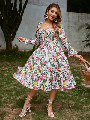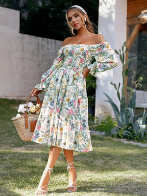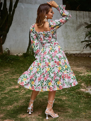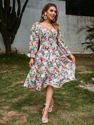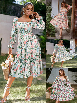Fånga känslan av sommaren med denna vackra blommiga midi klänning. Perfekt för dagar fyllda av sol, skratt och oförglömliga minnen, vare sig du är på picknick, bröllop eller en avslappnad stadspromenad.