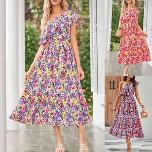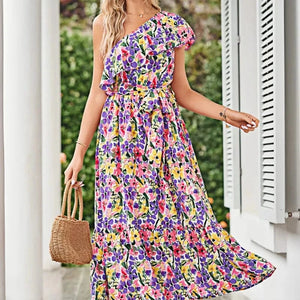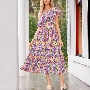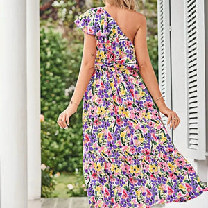 Ge din sommargarderob en fräsch uppdatering med denna underbara blommiga one shoulder-klänning. Perfekt för allt från sommarfester till lata dagar i solen – en klänning som låter dig stråla av självförtroende och elegans.