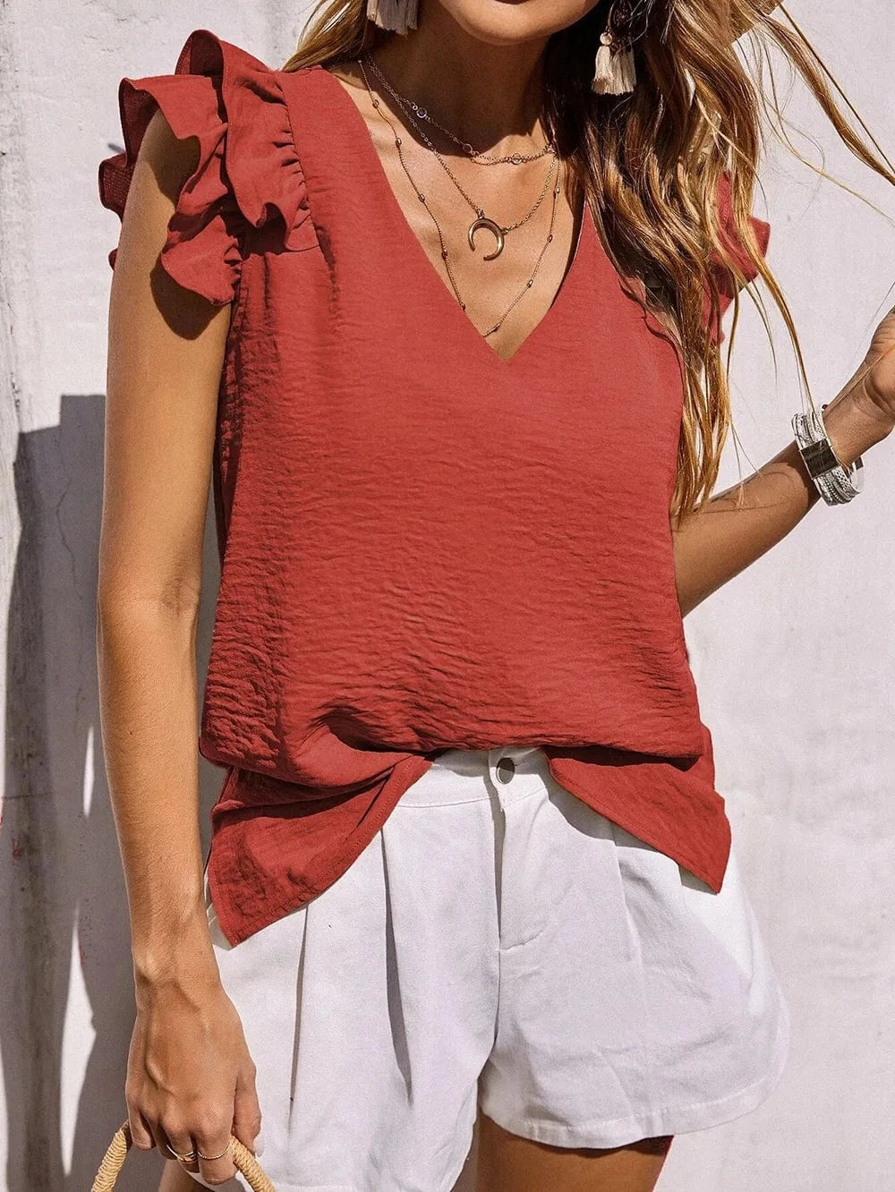 Låt sommaren omfamna dig med denna eleganta blus med volangärm – perfekt för både vardag och mer uppklädda tillfällen. Den luftiga passformen och de mjukt fallande volangerna ger en känsla av sofistikerad enkelhet.