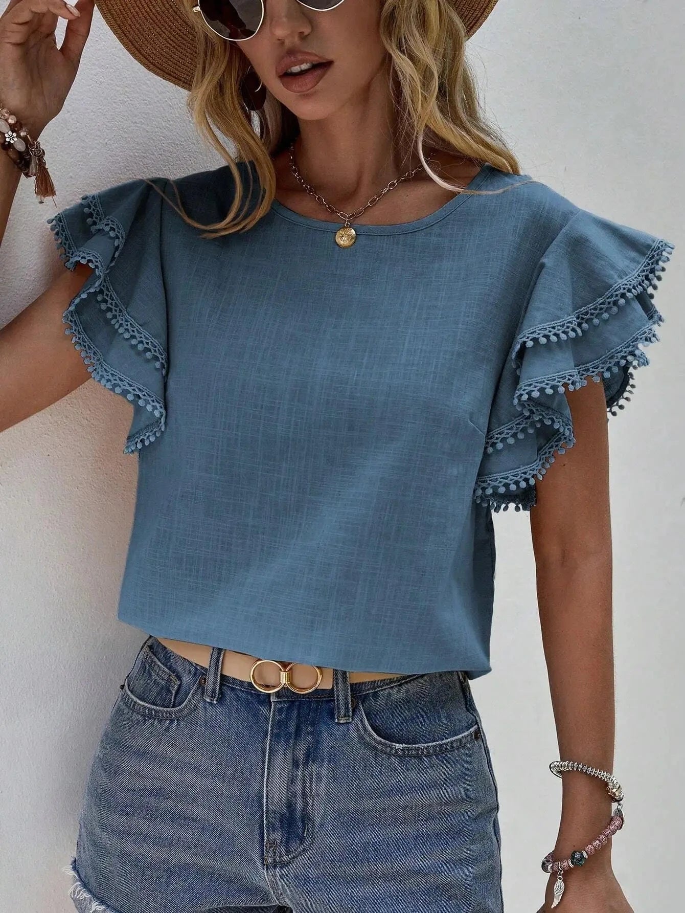 Ge din garderob en romantisk och luftig touch med vår blus med volang. Med sina korta batwing-ärmar och dekorativa volangdetaljer är den det perfekta plagget för en chic och bekväm sommarlook.