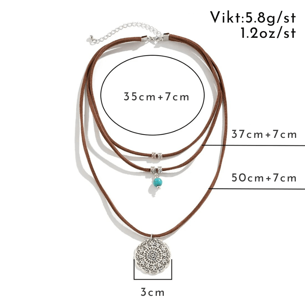 Fånga den fria andan med detta boho-halsband i tre lager. Kombinationen av mockaliknande band, turkos pärla och ett dekorativt mandalahänge skapar en stil som känns både naturlig och sofistikerad.