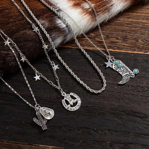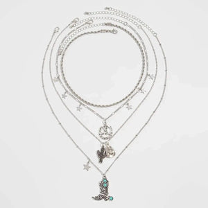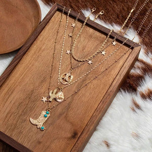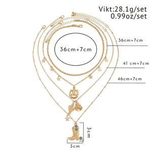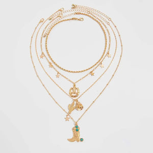 Låt din stil blomstra med detta bohemiska halsbandset i flera lager. Med sina charmiga berlocker, stjärnor och western-inspirerade detaljer blir det en självklar favorit för både vardag och fest.