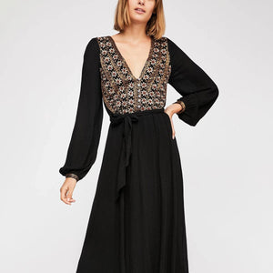 Låt din personliga stil blomma ut med vår bohemiska svarta klänning – en lång, svepande dröm som kombinerar avslappnad frihet med sofistikerad charm.