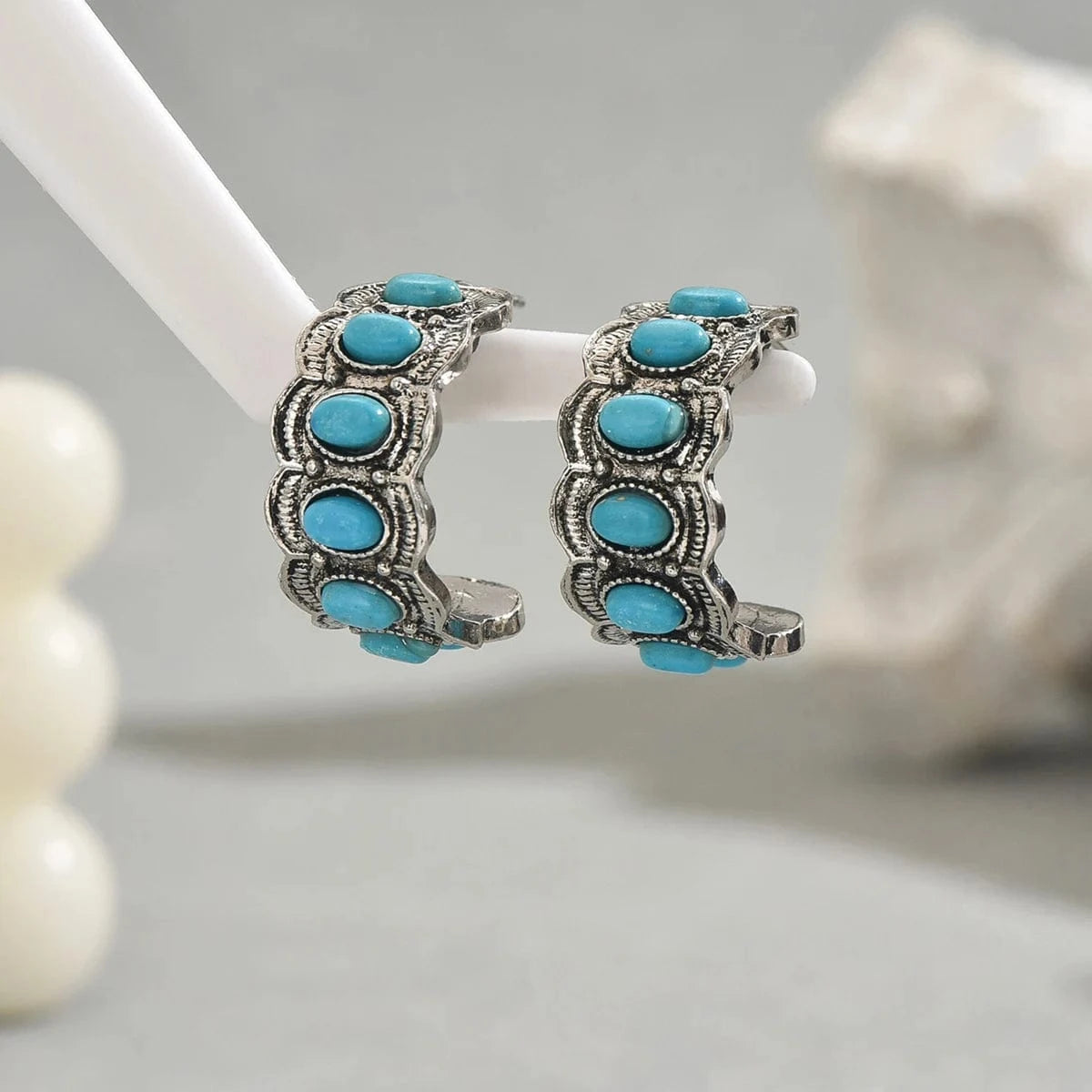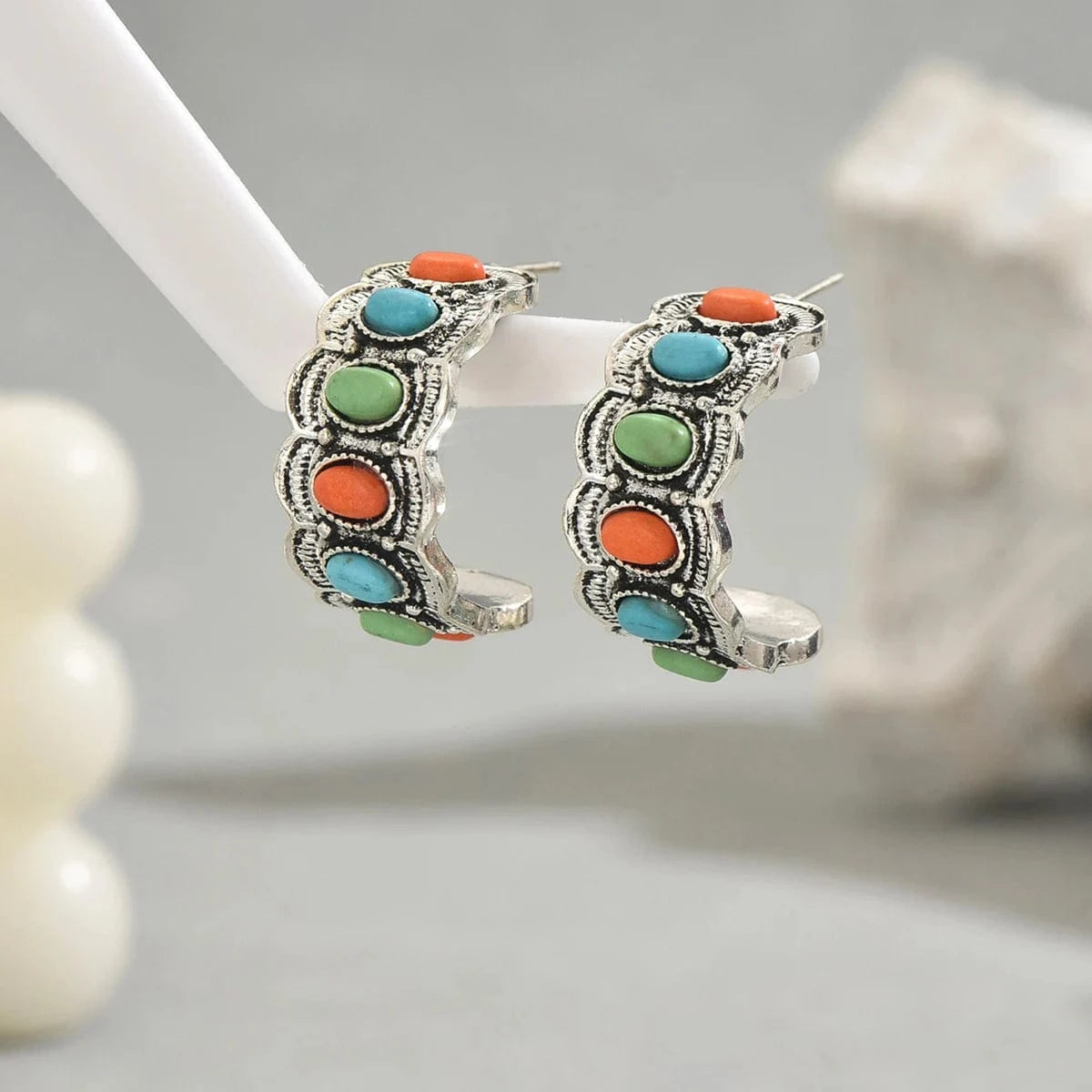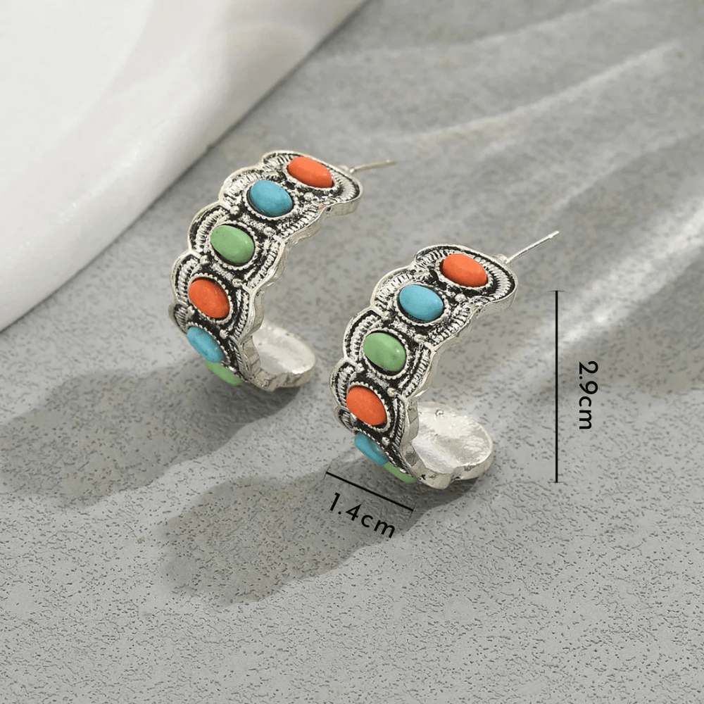Lyft din stil med dessa bohemiska creoler i silver, prydda med livfulla turkosa och färgade stenar. En perfekt balans mellan etnisk charm och modern trend – designade för dig som vill sticka ut med elegans och karaktär.