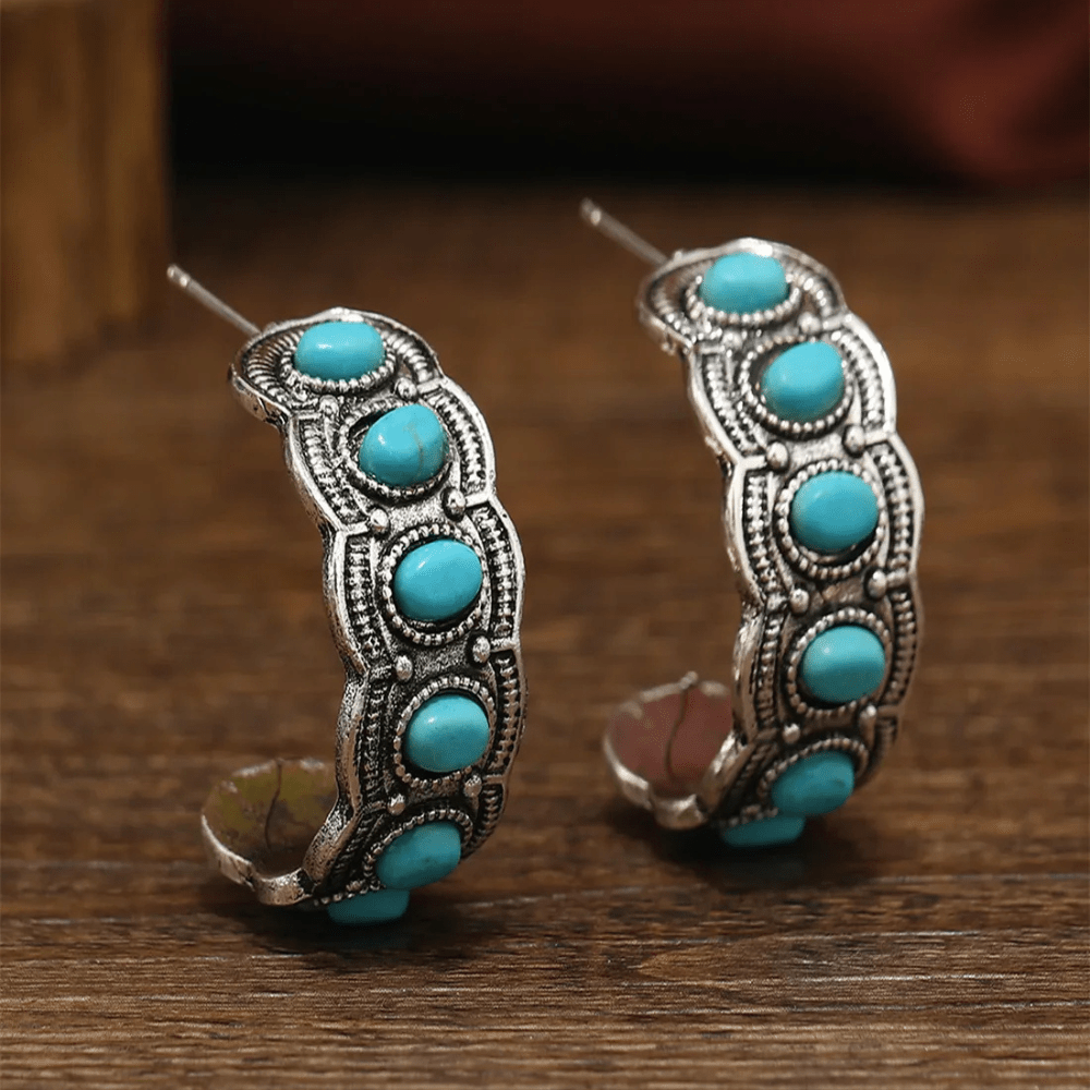 Små men slående creoler med turkosa cabochoner och antiksilver som fångar ljuset precis rätt. De ger din look en äkta western-twist – från city till country dance.