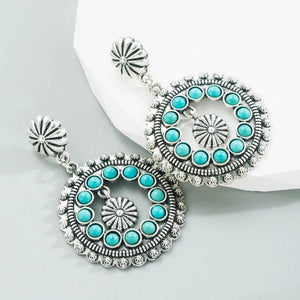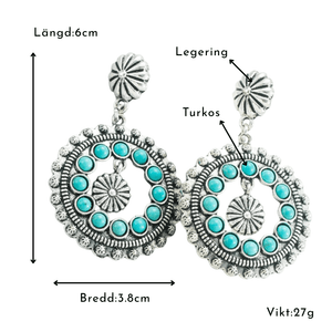 Ett par statement-örhängen som fångar boho-viben med västernkänsla. De runda “concho”-inspirerade cirklarna ramas in av turkosfärgade stenar som rör sig mjukt när du gör entré – från jeans och boots till siden och klackar.