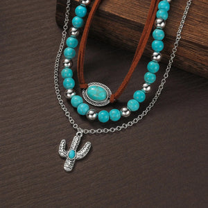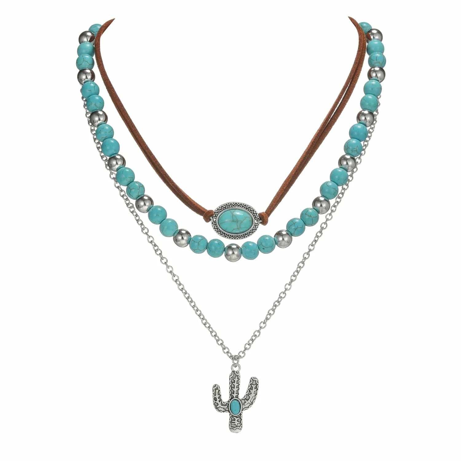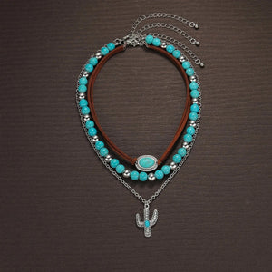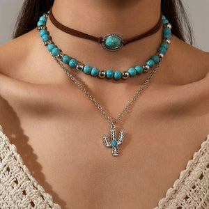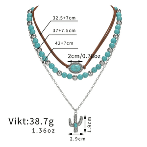 Skapa en unik boho-look med detta halsbandsset där turkosa pärlor och kaktusmotiv förenas i en harmonisk blandning. Perfekt för dig som älskar att uttrycka din personlighet genom smycken.