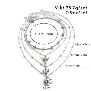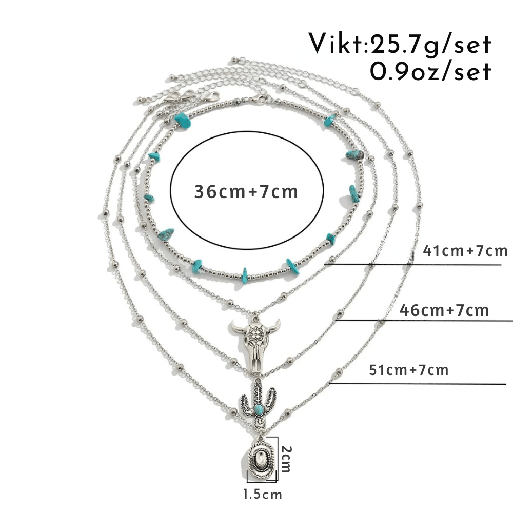 Flera lager av kedjor, turkosa detaljer och symboliska hängen skapar ett halsband som känns både mystiskt och uttrycksfullt. Perfekt för dig som älskar att mixa bohemisk energi med western-inspirerad charm.