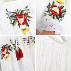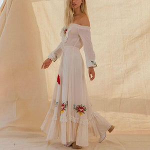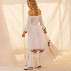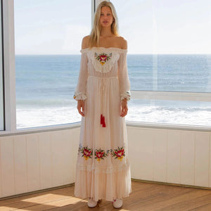 Lyft din stil med vår vita boho chic klänning – en svepande maxiklänning med broderade blommor och off-shoulder-design som utstrålar både frihet och elegans.