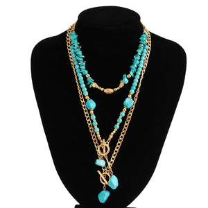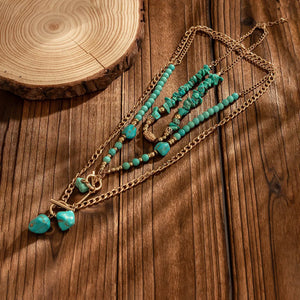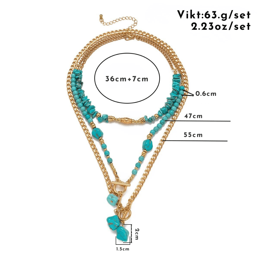 Låt din inre cowgirl ta plats med detta lager-på-lager-halsband i turkos sten och metall. Kombinationen av bohemiska former, råa detaljer och en touch av western gör det här halsbandet till ett självklart statement som ramar in både din outfit och din attityd. Perfekt när du vill förstärka din look med något unikt, kraftfullt och ändå elegant.