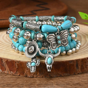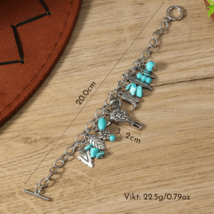 Låt ditt handledssmycke bli mer än bara en accessoar – detta bohemiska armband vävs samman av turkosa pärlor, läder och charmiga berlocker som andas frihet, äventyr och western-känsla. Perfekt för dig som vill bära något som känns både jordnära och sofistikerat.
