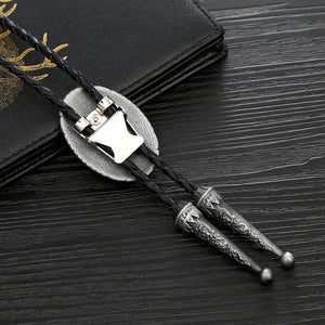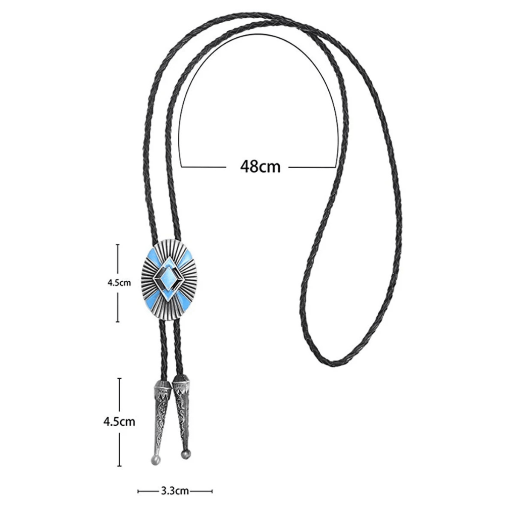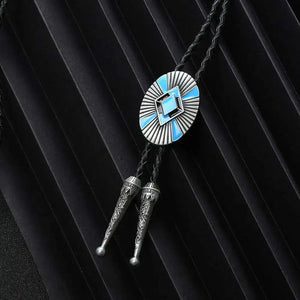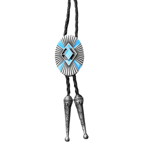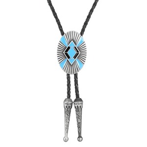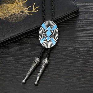 Denna bolo tie kombinerar westernstil med grafisk precision. Det ovala hänget med geometriska blå accenter fångar ljuset och drar blickarna – perfekt för dig som vill bära något både klassiskt och unikt.