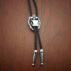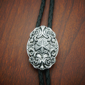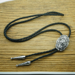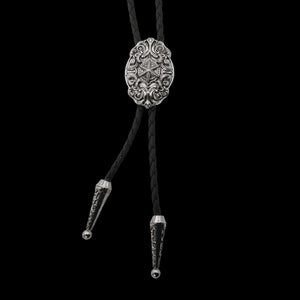 Den här bolo tie:n kombinerar klassisk cowboy-estetik med modern detaljrikedom. Med ett ovalt medaljonghänge i antiksilverfärgad legering, dekorerat med blommönster och stjärnmotiv, lyfter den varje outfit med ett raffinerat westernuttryck.